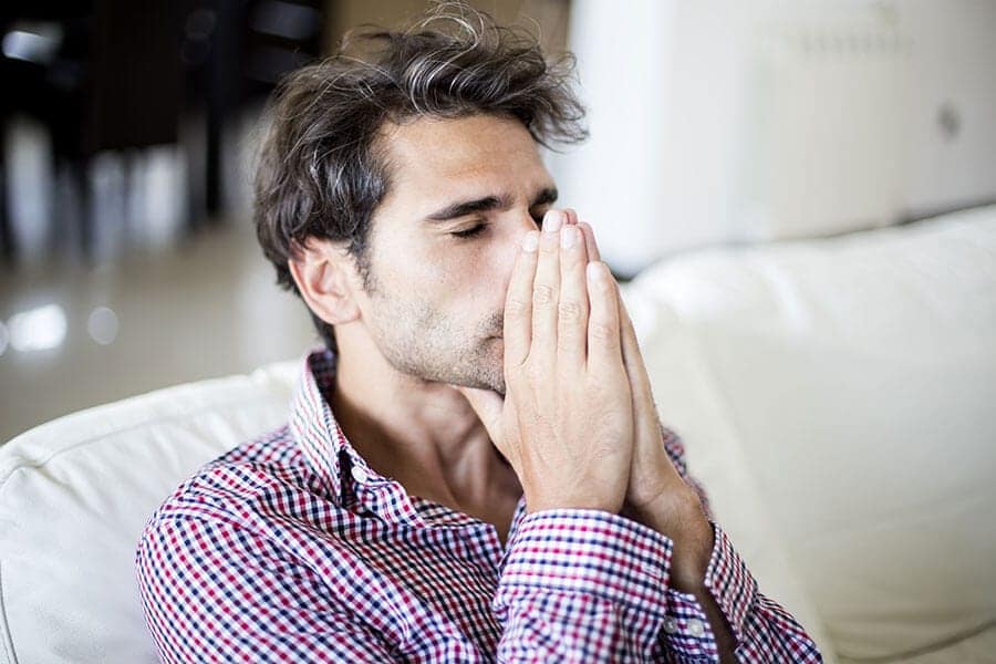 Man sitting on sofa with hands to face, dealing with an opiate withdrawal.