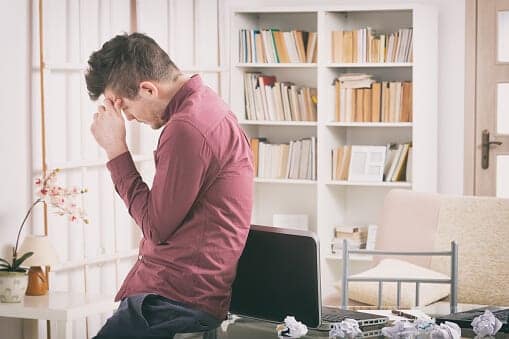 Man leaning on computer, holding head suffering vicodin side effects.The abuse of painkiller medications like Vicodin has become an alarming problem in today’s society. Though narcotic analgesics can offer effective short-term pain relief following injuries or surgical procedures, trouble can arise with little warning when extended use occurs. Vicodin side effects can put users at extreme risk for health problems, including accidental overdose and death, so professional help is recommended to anyone who struggles with this type of addiction.